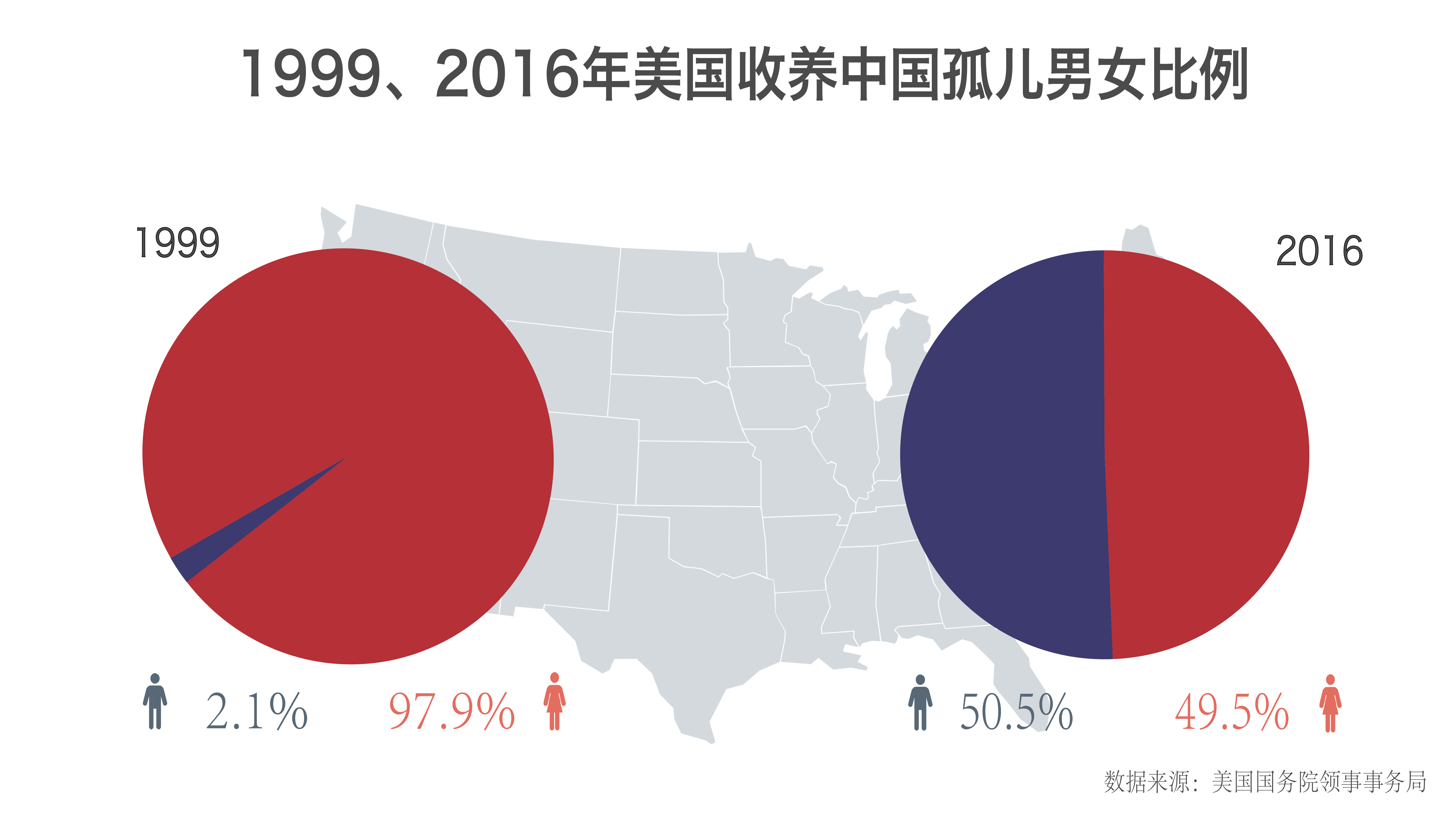 可追溯的公开数据显示,1999年,被美国收养的女孩比例高达97.9%。到了2016年,被收养孤儿男孩比例已经超过女孩。