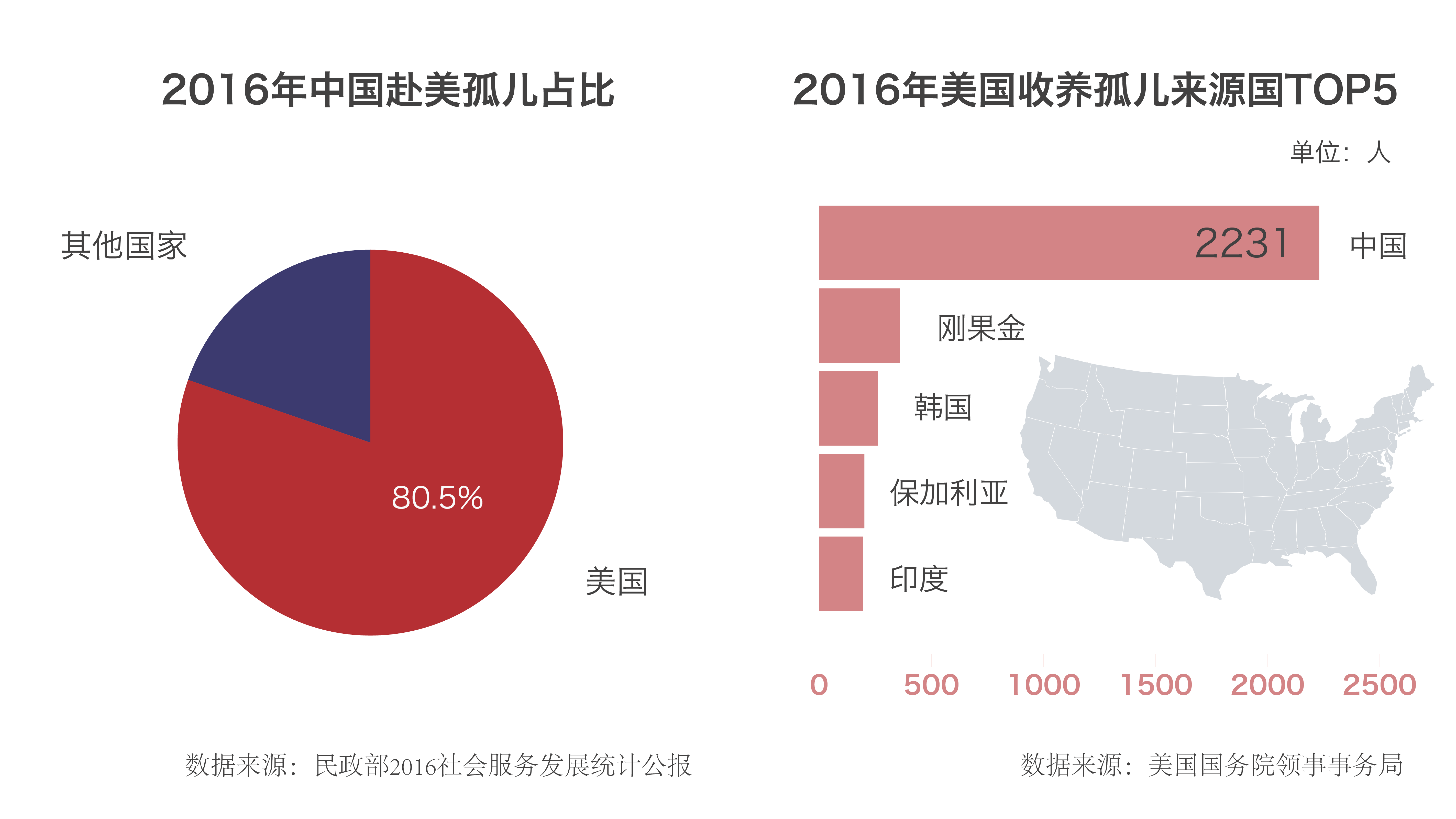 2016年,中国再次成为美国最大的孤儿送养国,这一年有2231名孩子被美国收养。而二十多年来,因为被美国家庭收养而改变命运的中国孤儿如今已经成为美国社会一个特殊的移民群体。美国国务院的海外收养数据显示,从1991年底中国政府颁布《中华人民共和国收养法》以来,一共有92907个被收养的孤儿,二十多年间,在中国出生,在美国家庭长大。